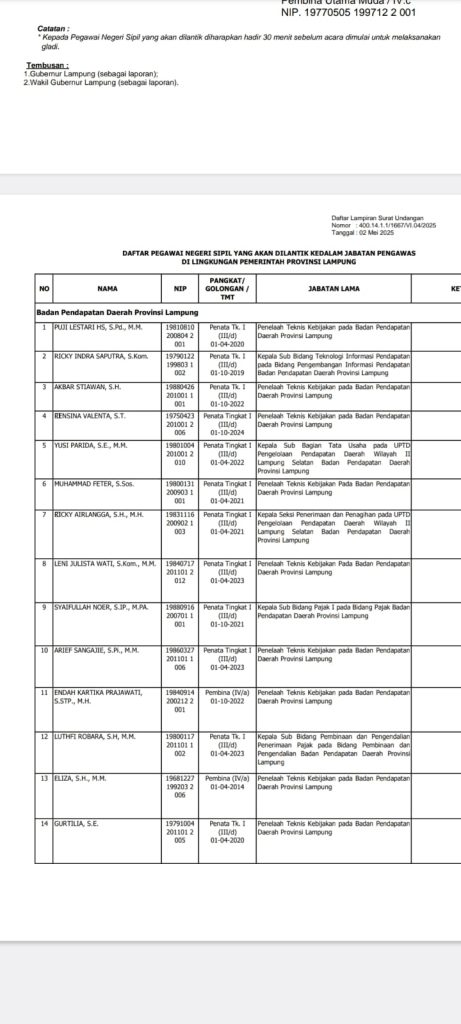 Berikut adalah nama-nama pejabat di lingkungan Badan Pendapatan Daerah (Bapenda) Provinsi Lampung yang dimutasi jabatannya: