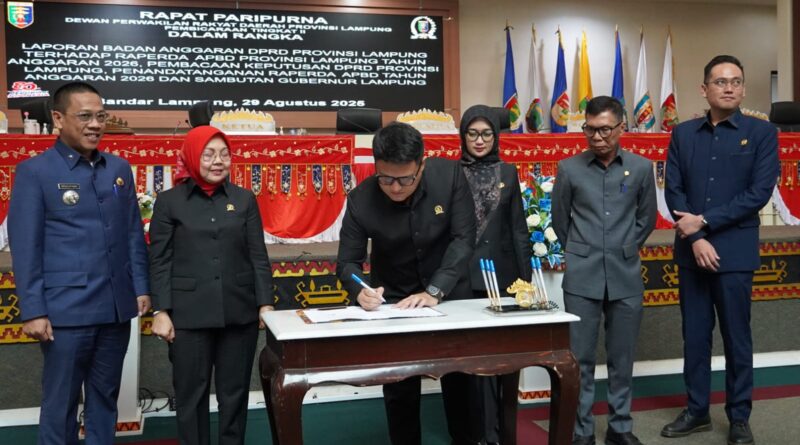 Bandar Lampung – Pemerintah Provinsi Lampung bersama Dewan Perwakilan Rakyat Daerah (DPRD) Provinsi Lampung menyepakati Rancangan Peraturan Daerah (Raperda) tentang Anggaran Pendapatan dan Belanja Daerah (APBD) Tahun Anggaran 2026. Persetujuan bersama ditandai dengan penandatanganan pada Rapat Paripurna yang digelar di Ruang Sidang DPRD Provinsi Lampung, Jumat (29/08/2025).