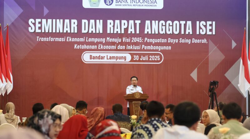 Bandar Lampung — Gubernur Lampung diwakili Sekretaris Daerah Provinsi Lampung, Marindo Kurniawan menjadi narasumber sekaligus membuka secara resmi Seminar dan Rapat Ikatan Sarjana Ekonomi Indonesia (ISEI) Provinsi Lampung Tahun 2025 di Auditorium Bank Indonesia Perwakilan Lampung, Rabu (30/7/2025).