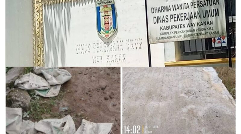 PENUTUR.INFO, Way Kanan – Pengerjaan rabat beton jalan ruas Kabupaten Way Kanan di beberapa titik lokasi belum genap sebulan sudah mengalami kerusakan hal ini disampaikan oleh beberapa masyarakat dan pengguna jalan di 2 titik lokasi di 2 kecamatan berbeda, kamis (05/02/2026).